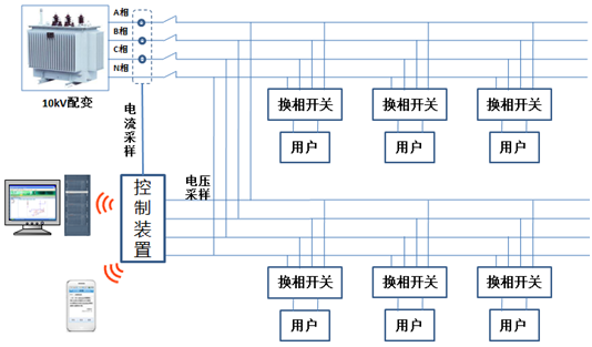 换相开关型三相负荷自动调节装置是由一个智能换相终端和若干个换相开关单元组成。智能换相终端实时监测配变低压出线的三相电流,如果在一定周期内监测配变低压侧三相负荷不平衡度超限,智能换相终端读取配变低压出线和所有换相开关单元各负荷支路的电流、相序实时数据,进行优化计算,发出最优换相控制指令,各换相开关单元按照规定换相流程执行换相操作,实现用户负荷相序调整、配电台区三相负荷均衡分配。调整的范围(周期)可根据局方数据自由设定。