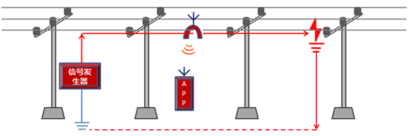 当配电线路发生接地故障后,在线路停电状态下,在故障线路任意点处,通过信号发生器向线路注入具有一定功率的异频信号,再通过采集器测量注入点两侧的信号强度,通过手持PDA(手机APP)显示的数据判断故障点侧与故障相别。